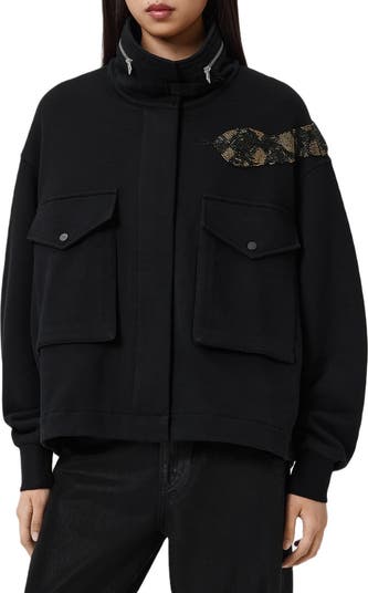 A shimmering sequin-and-bead snake uncoils itself across the back and around one shoulder on this coolest of jackets made in an oversized fit from organic cotton. A two-way zip detail on the collar reflects the ouroboros theme.