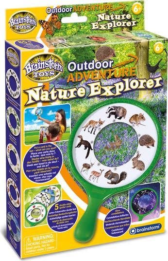 Be an outdoor detective and explore the natural world! Simply slot a spotter card into the 7.1" (182mm) diameter viewer and use to identify objects in your garden and beyond. Comes with five double-sided, full-color cards that are 6.9" (175mm) diameter with an 3.3" (85mm) viewing area. Ten themes to choose from: mammals, animal tracks, birds, trees, flowers, seashore, butterflies & moths, bugs and clouds plus a glow in the dark constellation spotter. Photo-real images help children to observe up to eight natural items on each side of the card. Chunky handle for ease of use. Cool compartment in the handle for storing your natural treasures.