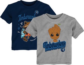 Your little Timberwolves fan can join the Guardians of the Galaxy with this fun Minnesota Timberwolves T-Shirt Two-Set. One shirt features Groot and the team wordmark, while the other showcases Rocket Raccoon with team graphics, offering two fun options for your little one to show their Timberwolves spirit. This set is perfect for game days, watching parties, or any occasion when your little one wants to show their love for the Timberwolves and the Guardians of the Galaxy!