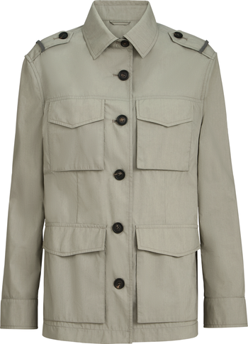 - Horn button closureShirt-style collarButton cuffsUpper patch pockets with flap and buttonPatch hand pockets with flap and buttonEpaulettes with buttonsUnlinedNickel-free monili decoration