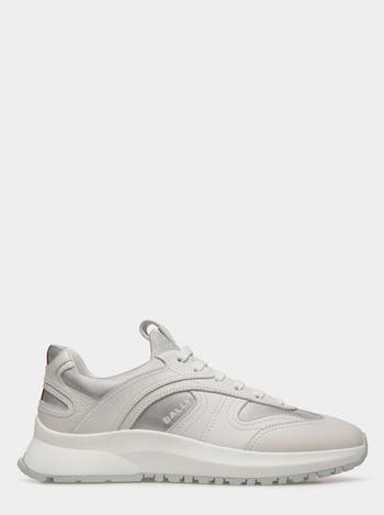 This Outline sneaker combines white leather and nylon. The thick rubber sole interprets classic running looks, complete with Bally grip tread on the Vibram outsole.