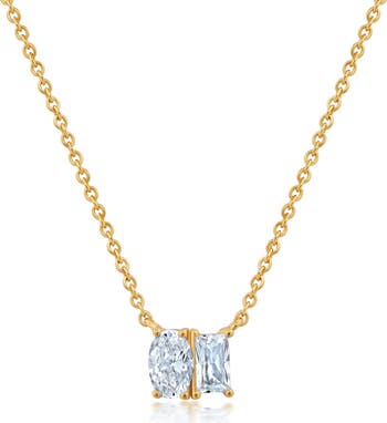 Hand-set cubic zirconia in oval and baguette cuts create a sparkling pendant on this gleaming chain necklace plated in platinum or 18-karat gold.