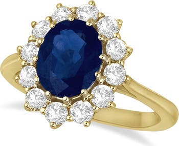 - This ring is inspired by the engagement ring worn by Princess Diana and Princess Kate Middleton. The unique statement ring features a genuine and natural oval shaped 9x7mm bright blue sapphire that is complemented by 12 brilliant-cut round near-colorless diamonds of G-H Color, SI Clarity in a halo fashion. The colored gemstones and clear diamond stones rest on a 14kt yellow gold band.