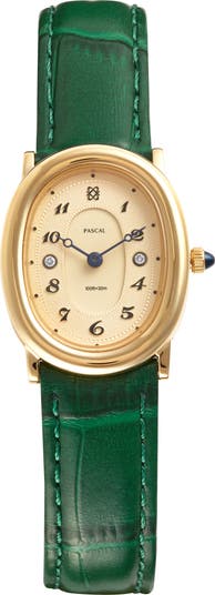 A croc-embossed-leather strap frames the oval case of this contemporary watch with design features that echo back to a century ago, including art deco hands and tonal-textured dial set with two bezel-set lab-grown-diamond markers.