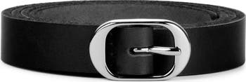 A narrow version of our classic 100% leather belt with an oval shaped solid brass buckle, designed for daily wear by men and women.