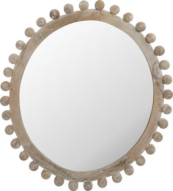 - A boho-inspired wall mirror that showcases an intricately carved wood frame in a whitewashed finish