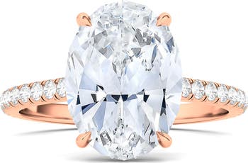 An oval-cut lab-grown diamond centers the pavé band of this 18-karat gold ring that brings fiery sparkle to any ensemble.