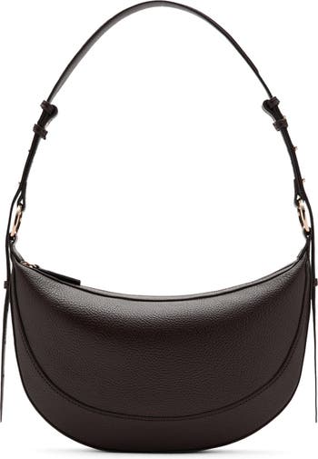 A deep crescent-shaped profile underscores the structured silhouette of a sleek faux-leather bag designed with a spacious interior and adjustable strap for versatile wear.