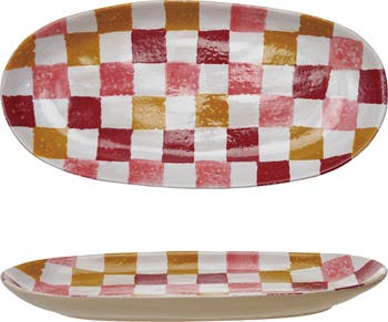 - A vibrant oval stoneware platter featuring a hand-painted check pattern in multicolor