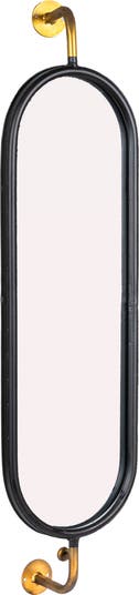 This black and gold oval wall mirror with brackets adds style and depth to any living space. This artfully crafted mirror showcases a sleek black metal frame with contrasting gold-finished wall brackets that create a stunning visual effect. The mirror is made of metal, glass, and reclaimed wood for a durable and stylish look. The mirror has hanging mechanisms for easy installation and can be hung vertically only. This mirror is perfect for adding a touch of sophistication and edginess to any living room, bedroom, or hallway. It measures 9.5 inches long by 38 inches high, making it a perfect size for any space. This mirror is a stunning piece that will add a touch of sophistication to any home.