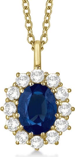 - Inspired by jewelry worn by Lady Diana and Princess Kate Middleton, this gorgeous Precious Gemstone pendant necklace features an oval-shaped 9x7mm Blue Sapphire accented by 12 brilliant-cut round diamonds in a halo style.