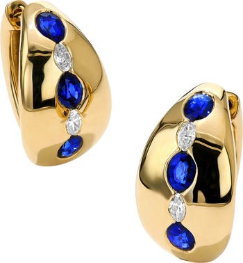 Perfectly polished 18-karat gold is paired with beautiful blue sapphires and twinkling diamonds on chunky huggie hoop earrings.