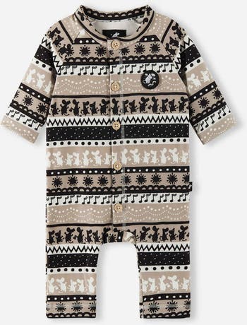 Warm romper suit for babies. Helps to regulate little ones' temperatures. With cute button-up front and a pretty pattern. Ideal for winter.