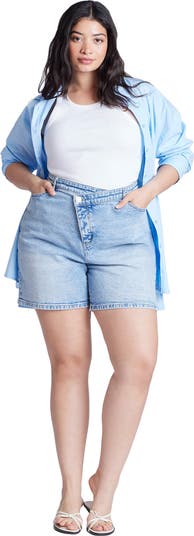 A relaxed 6" short in stretch denim with a crossover high-rise waist.