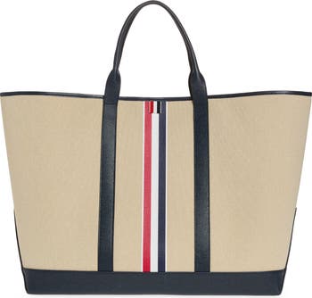 In true Thom Browne tradition, red, white and blue stripes star in this leather-trimmed canvas tote with a signature grosgrain loop tab and tricolor lining that carry the Americana theme.