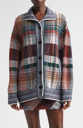 Engineered on a Caperdoni loom for depth and definition, the check pattern reads like a modern plaid mosaic on this oversized cardigan with a clean button front. Warm yet breathable in an alpaca-enriched wool blend, it drapes with relaxed structure and brings graphic energy to pared-back staples.
