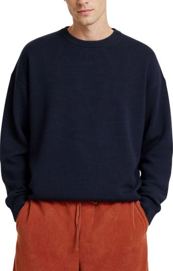 Roomy and relaxed, this chunky crewneck sweater features thick ribbing at the collar and cuffs and solid coloring save for bold logo details brightening the back. The dropped shoulder seams emphasize the boxy, slouchy fit that's perfect for layering when the temperatures drop.