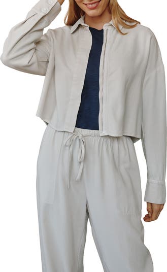 A cropped length puts a modern spin on this oversized, workwear-inspired shacket made of flowy woven fabric and ready for lightweight layering.
