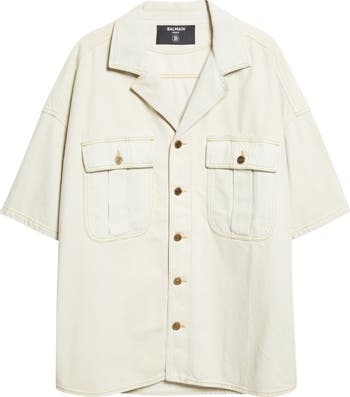 A camp shirt with cargo pockets and dropped shoulders blends workwear with vacation vibes in a cut from bleached-out denim with the original blue wash ghosting through the topstitched seams.