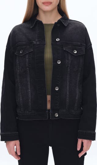 Dropped shoulders enhance the relaxed fit of this casual-cool jean jacket made from comfortable stretch denim.