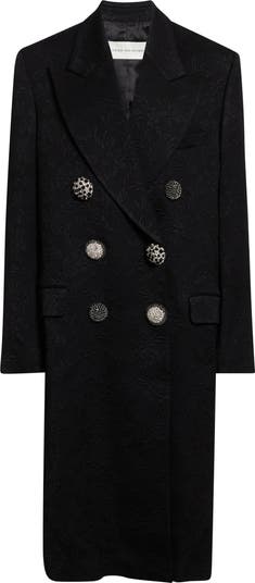 Lightly puckered blooms texture this oversized matelassé jacquard coat that's expertly tailored with wide peaked lapels and softly padded shoulders. Mismatched rhinestone buttons in a variety of designs bring a decidedly retro aesthetic to this distinctive style.