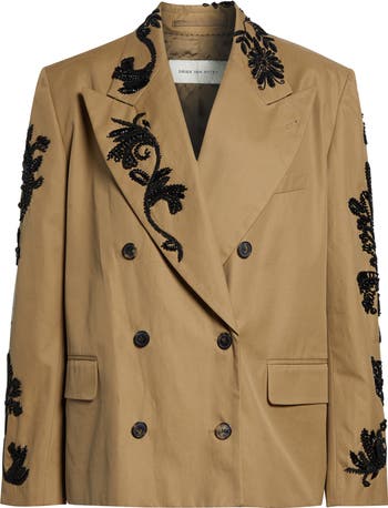 Matador-inspired embroidery set off with glossy beads adds a richly ornate detail to this oversized jacket fashioned from microsand cotton twill that creates a look for both the office and evening events.