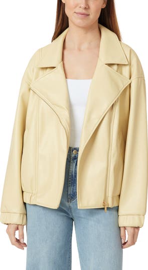 Dropped shoulders enhance the relaxed fit of this front-zip moto jacket textured in sleek faux leather.