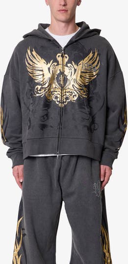 Dropped shoulder seams emphasize the slouchy, relaxed fit of a hoodie made of soft cotton with metal-and-shadow artwork ensuring you're never out of topics for starting a conversation. Mottled coloring reinforces the old-favorite look and the worn-it-forever vibe.