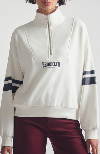A relaxed fit makes layering easy with this varsity-inspired half-zip sweatshirt punctuated by a sporty logo print and contrast sleeve stripes.
