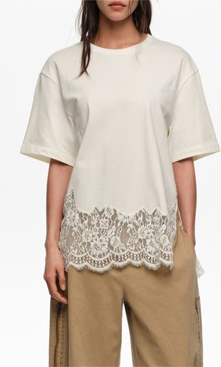 Oversize long T-shirt in a cotton blend. Designed with a crew neck, short wide sleeves, an embroidered logo, and lace at the hem