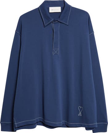 This long-sleeve polo plays with outline and proportion, using bold topstitching to emphasize its oversized silhouette. Airy cotton piqué keeps it light on the body, while the small motif near the hem signs it off with restraint.