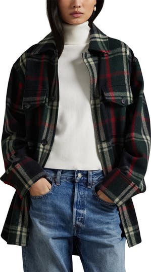 An oversized fit amplifies the ultracozy vibe of this soft wool-blend shirt jacket framed by utility-inspired pockets and a curved hem.