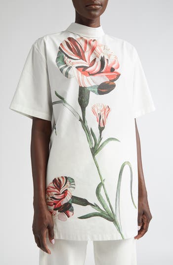 A richly textured rose takes up space on a mock-neck top cut from lightweight Italian cotton with a subtly notched high-low hem.
