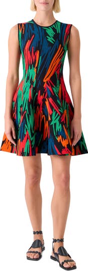 A playful crayon-scribbled print in an exploded scale lends a sense of joie-de-vivre to this sleeveless jacquard-knit dress in a fit-and-flare silhouette.