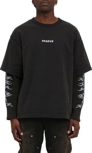 Dropped shoulders emphasize the boxy, relaxed fit of a T-shirt made of breathable cotton and constructed with waffle-knit long sleeves layered under elbow-length outer sleeves. Sequined details on the chest and forearms bring a shimmery finish to the eminently laid-back look.