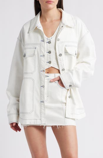 Dropped shoulders enhance the relaxed oversized fit of this denim jacket contrasted with topstitching and finished with side vents for easy movement.