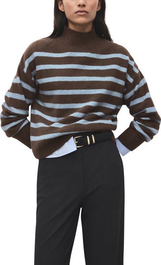 Stripes project zesty personality in this mock-neck sweater knit from a cozy yarn blend.