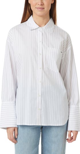 An oversized silhouette brings an air of casual appeal to this crisp poplin button-up shirt made with slim striping.