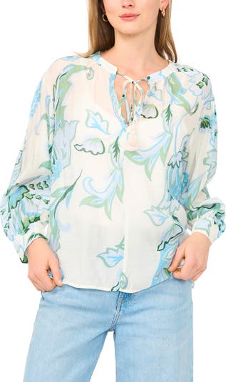 Punch up your look from casual to more refined with the vibrant print and silky feel of this top with tassel-tipped ties at the split neck.