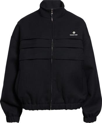 The Shanghai-based design duo Shushu and Tong—Liushu Lei and Yutong Jiang, respectively—bring a utilitarian element to their schoolgirl aesthetic with this oversized hopsack track jacket fashioned with deep horizontal tucks across the chest and logo embroidery as the singular embellishment.
