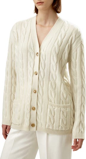 This luxurious oversized cardigan has loose shoulders, a classic cable weave, and stylish horn buttons. Made with 70% wool and 30% cashmere, it pairs well with leggings or palazzo pants for work, casual outings, or loungewear.