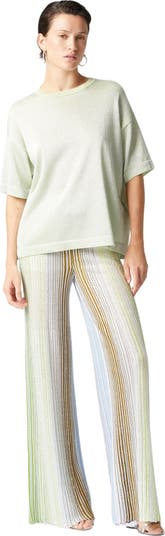 Missoni SS25 collection takes inspiration from the deserts, the sand, the oasis, and the color of the sky. The warmer color tones, reflect the endless lands of sand and all their hues. Green grass of the oasis, blue waters and contrast with the sandy color of the desert cover the rest of the collection's palette. The influence of this atmosphere echoes in the looks through stratifications, materials which are drier to the touch, fluidity and softness of shapes.