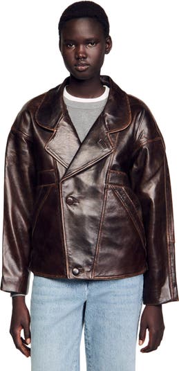 Oversized leather jacket with suit-style lapel collar, wrap design with covered buttons and front slash pockets.