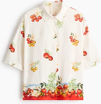Oversized shirt in an airy linen and viscose weave with an all-over print. Features a collar, buttons down the front and an inverted box pleat at the back. Dropped shoulders, short sleeves and a straight-cut hem.