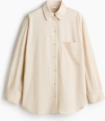 Oversized shirt in woven fabric with a collar, buttons down the front and an open chest pocket. Yoke at the back, gently dropped shoulders and long sleeves with buttoned cuffs and a sleeve placket with a link button. Curved hem.
