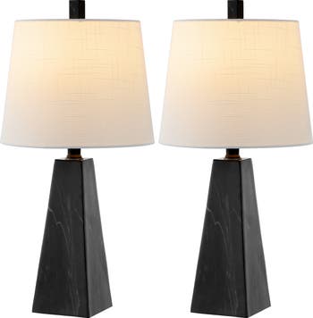 Modern and eye catching, this chic table lamp features an elegant resin base in mixed shades of white and gray to create the effect of marble, but without the inconsistencies inherent in natural stone. This lux finish, coupled with the geometric faceted pyramid silhouette, evokes a modern interpretation of a neoclassical design. The white fabric shade diffuses soft light into any living space, in contrast to the geometric edges of the lower design and the lamp is topped with a matching marbleized resin finial.