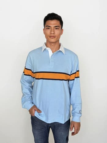 Our Oxford Club Rugby Shirt is a fresh take on the classic American rugby—crafted from 100% cotton for all-season wearability and long-lasting comfort. Designed with a bold orange and navy contrast stripe through the chest and finished with premium rubber buttons along the front placket, this shirt blends vintage sport style with elevated details. The easy fit offers a clean silhouette, while the embroidered L&F shield logo adds a signature heritage touch. Whether layered or worn solo, this versatile piece delivers casual sophistication from weekday to weekend. Perfect for cooler evenings, travel days, or effortless layering—this rugby shirt is the kind of piece that earns its place in your closet all year long.