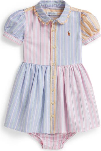 Oxford stripes are juxtaposed on a puff-sleeve shirtdress made of a lightweight cotton knit to keep baby feeling breezy—and looking preppy as can be. A ruffled Peter Pan collar adds to the appeal.