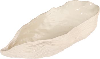 - A stunning stoneware dish shaped like an oyster shell, in a pristine white finish