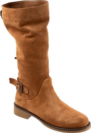 Adjustable buckles and a convenient zipper detail the slouchy shaft on a supple suede boot grounded by a cushioned footbed and grippy rubber sole.